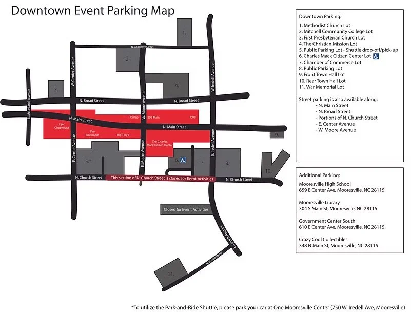 If you prefer to drive yourself into downtown, there will be some public parking areas, but they may fill up fast. Another good option for the 21+ crowd: use a rideshare service (Uber/Lyft). There’s a designated rideshare pick-up/drop-off spot at the public lot on the corner of Iredell Ave. and Church St. (across from the Chamber of Commerce). Easy to find, and hard to miss!